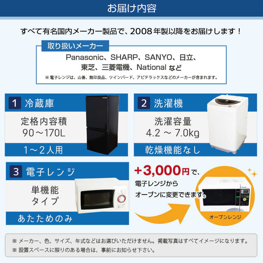 商品概要 国内メーカー限定 リユース家電3点セット 【冷蔵庫+洗濯機+電子レンジ】 【製造年】 2008年製以降の製品 【セット内容】 1. 冷蔵庫:2ドアタイプ、容量90〜170L 2. 洗濯機:全自動タテ型、容量4.2〜7.0kg 3. 電子レンジ:単機能タイプ(あたためのみ) 【オプション】 電子レンジをオーブンレンジに変更可能(+3,000円) オーブンレンジへの変更をご希望の場合、ご購入される前に項目選択肢で 「オプション」→「オーブンレンジ変更(税込+3,000円)」をお選びください。